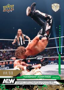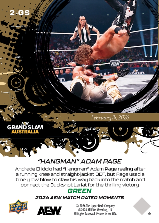 AEW UPPER DECK E-PACK MATCH DATED MOMENTS 2026 – “HANGMAN” ADAM PAGE – “HANGMAN” ADAM PAGE EARNS A SHOT AT THE AEW WORLD CHAMPIONSHIP WITH DEFEAT OF ANDRADE EL IDOLO #2-GS – GREEN PARALLEL