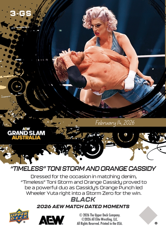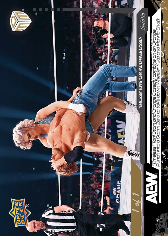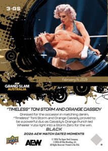 AEW UPPER DECK E-PACK MATCH DATED MOMENTS 2026 – “TIMELESS” TONI STORM AND ORANGE CASSIDY – “TIMELESS” TONI STORM AND ORANGE CASSIDY COMBINE ON AN ORANGE PUNCH INTO A STORM ZERO TO TAKE DOWN WHEELER YUTA AND MARINA SHAFIR #3-GS – BLACK PARALLEL