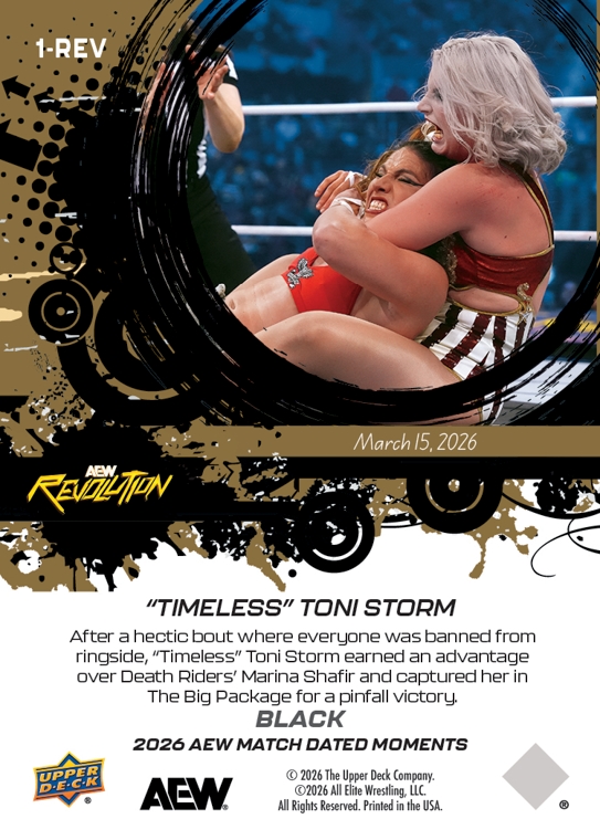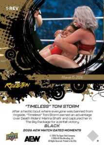 AEW UPPER DECK E-PACK MATCH DATED MOMENTS 2026 – “TIMELESS” TONI STORM – “TIMELESS” TONI STORM EARNS A HARD-FOUGHT PINFALL VICTORY OVER DEATH RIDERS’ MARINA SHAFIR #1-REV – BLACK PARALLEL