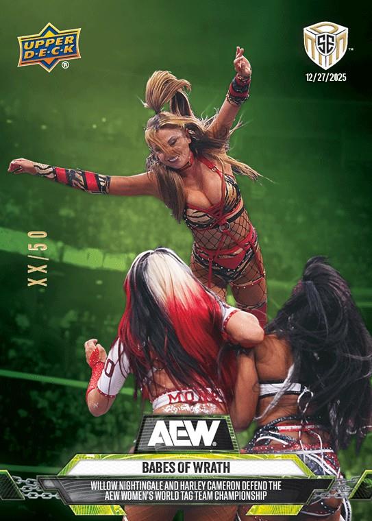 AEW UPPER DECK E-PACK MATCH DATED MOMENTS SPECIAL EDITION 2025 – BABES OF WRATH – WILLOW NIGHTINGALE AND HARLEY CAMERON DEFEND THE AEW WOMEN’S WORLD TAG TEAM CHAMPIONSHIP #25 – GREEN PARALLEL