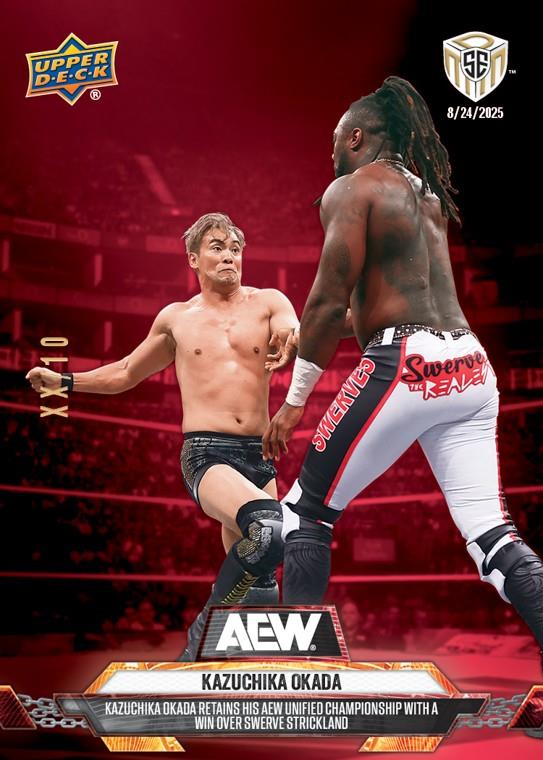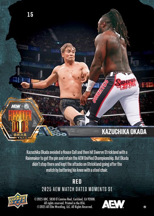 AEW UPPER DECK E-PACK MATCH DATED MOMENTS SPECIAL EDITION 2025 – KAZUCHIKA OKADA – KAZUCHIKA OKADA RETAINS HIS AEW UNIFIED CHAMPIONSHIP WITH A WIN OVER SWERVE STRICKLAND #15 – RED PARALLEL