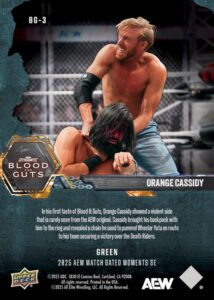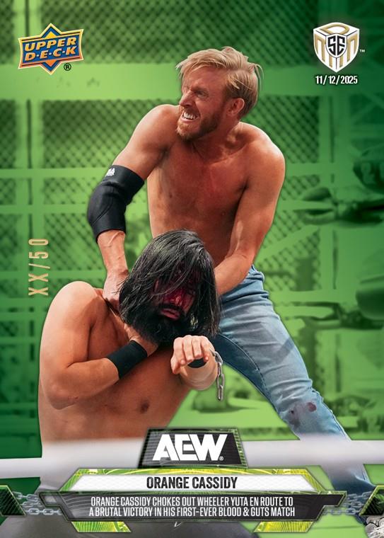 AEW UPPER DECK E-PACK MATCH DATED MOMENTS SPECIAL EDITION 2025 – ORANGE CASSIDY – ORANGE CASSIDY CHOKES OUT WHEELER YUTA EN ROUTE TO A BRUTAL VICTORY IN HIS FIRST-EVER BLOOD & GUTS MATCH #BG-3 – GREEN PARALLEL