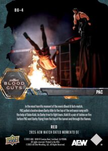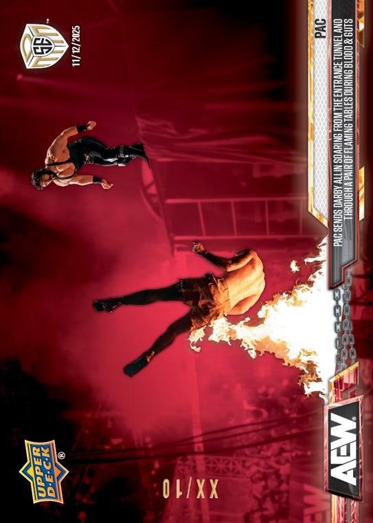 AEW UPPER DECK E-PACK MATCH DATED MOMENTS SPECIAL EDITION 2025 – PAC – PAC SENDS DARBY ALLIN SOARING FROM THE ENTRANCE TUNNEL AND THROUGH A PAIR OF FLAMING TABLES DURING BLOOD & GUTS #BG-4 – RED PARALLEL