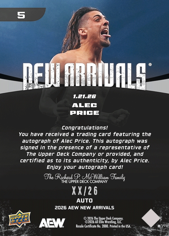 AEW UPPER DECK E-PACK NEW ARRIVALS 2026 – ALEC PRICE #5 – AUTOGRAPH