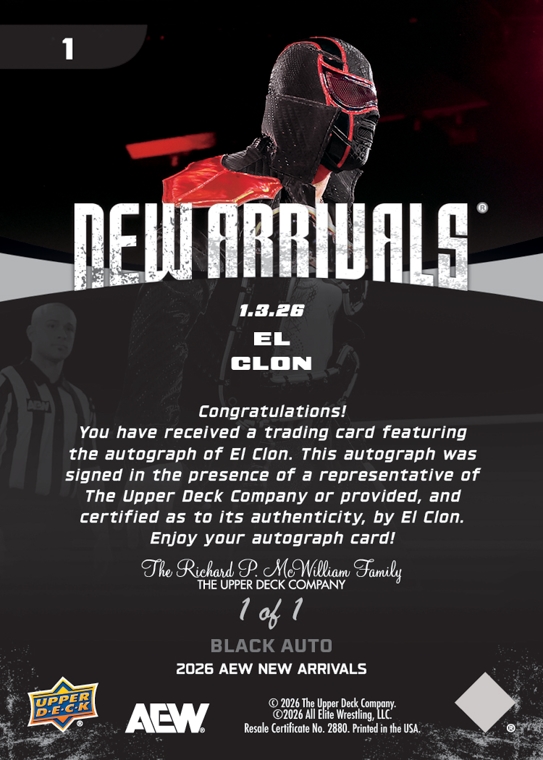 AEW UPPER DECK E-PACK NEW ARRIVALS 2026 – EL CLON #1 – BLACK PARALLEL AUTOGRAPH
