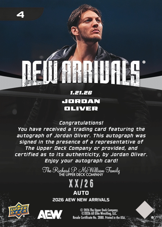 AEW UPPER DECK E-PACK NEW ARRIVALS 2026 – JORDAN OLIVER #4 – AUTOGRAPH