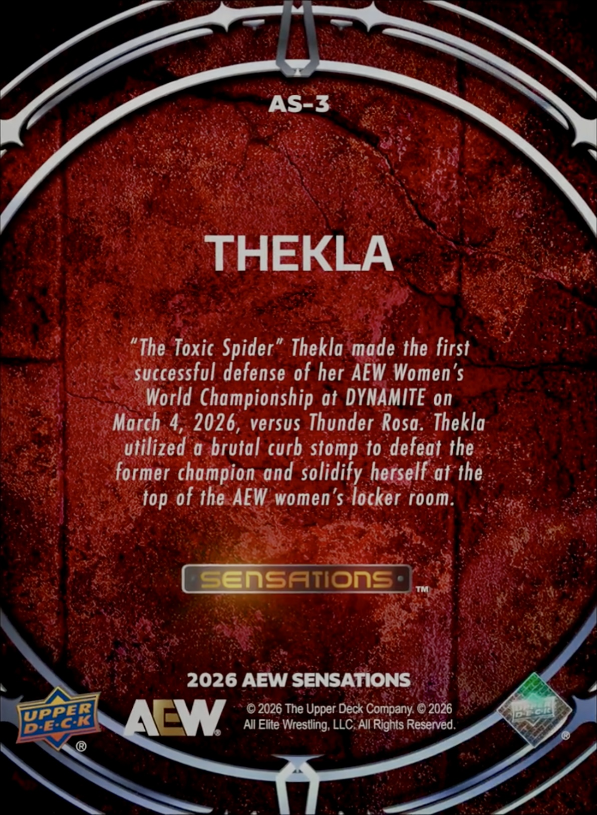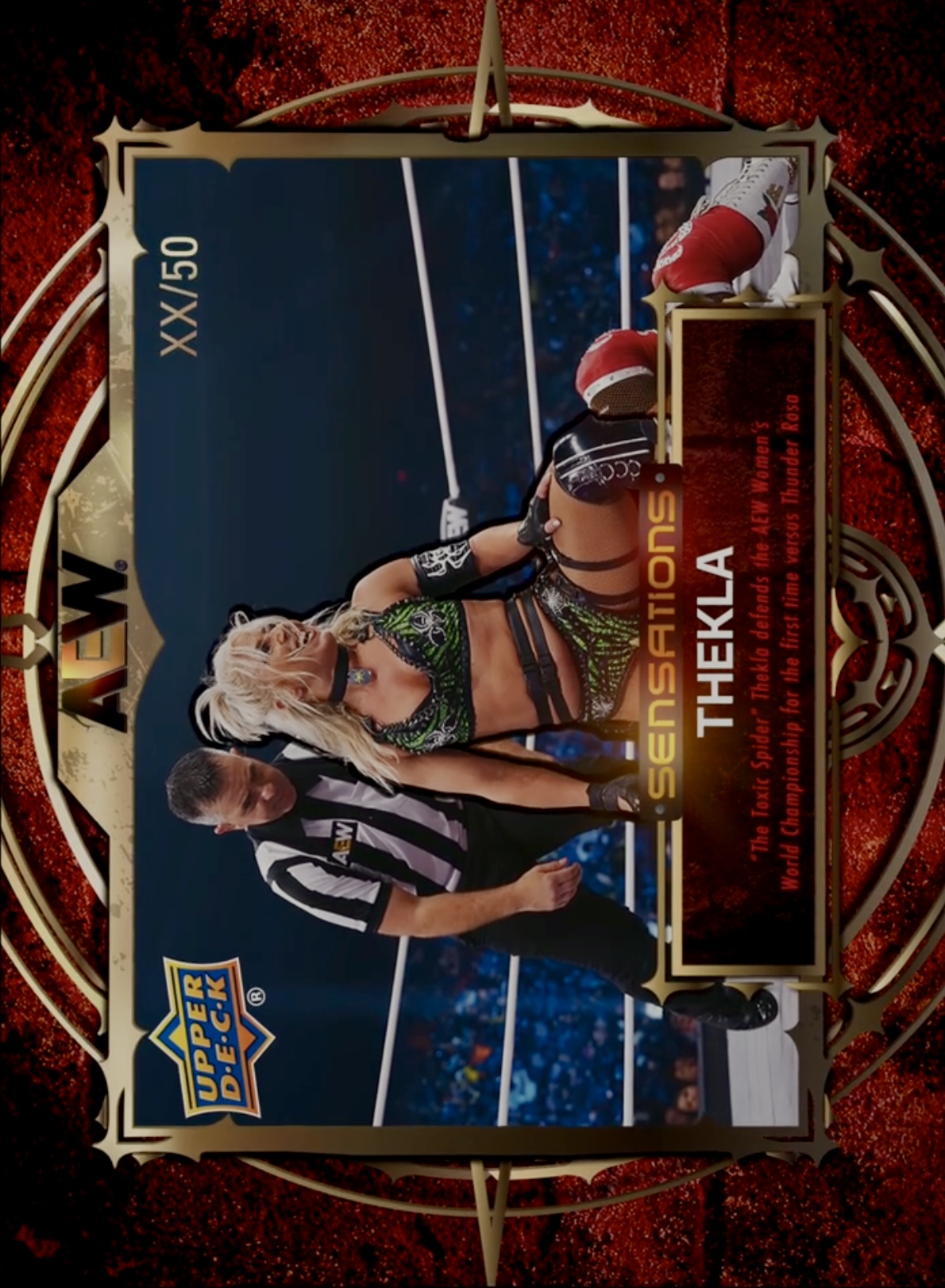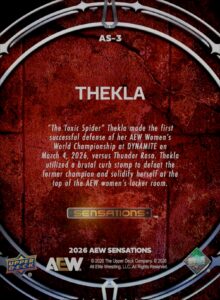 AEW UPPER DECK EVOLUTION SENSATIONS AUTHENTIC DIGITAL COLLECTIBLES 2026 – MAR. 4, 2026 – THEKLA – “THE TOXIC SPIDER” THEKLA DEFENDS THE AEW WOMEN’S WORLD CHAMPIONSHIP FOR THE FIRST TIME VERSUS THUNDER ROSA #AS-3 – GOLD PARALLEL