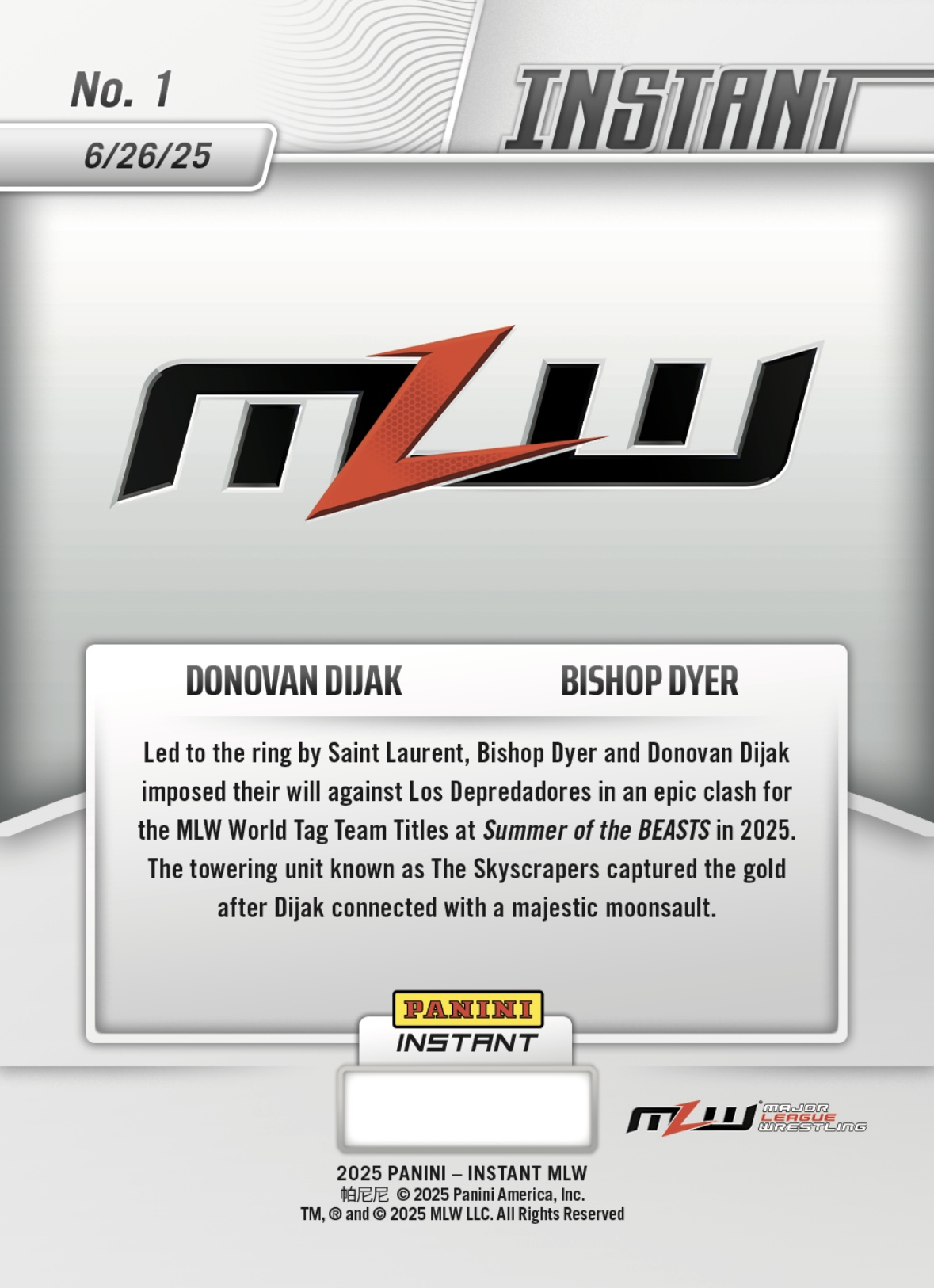 MLW PANINI INSTANT 2025 – DONOVAN DIJAK / BISHOP DYER – SKYSCRAPERS SOAR TO SENSATIONAL SUCCESS #1 – LIGHTNING PARALLEL