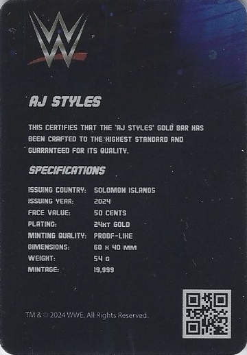 THE KOIN CLUB OFFICIAL WWE SUPERSTARS LENTICULAR GOLD COIN BAR COLLECTION 2024 – AJ STYLES