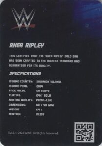 THE KOIN CLUB OFFICIAL WWE SUPERSTARS LENTICULAR GOLD COIN BAR COLLECTION 2024 – RHEA RIPLEY