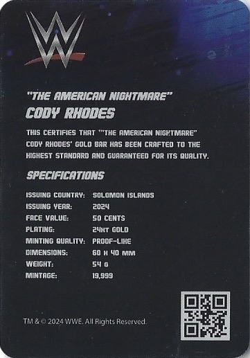 THE KOIN CLUB OFFICIAL WWE SUPERSTARS LENTICULAR GOLD COIN BAR COLLECTION 2024 – “THE AMERICAN NIGHTMARE” CODY RHODES