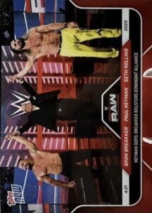 WWE TOPPS NOW 2025 – BRON BREAKKER / PAUL HEYMAN / SETH ROLLINS HEYMAN GUYS: BREAKKER BOLSTERS DOMINANT ALLIANCE #48 – RED PARALLEL