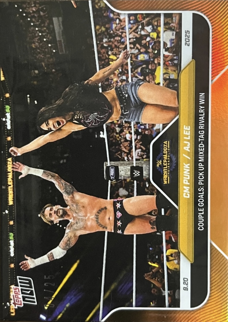 WWE TOPPS NOW 2025 – CM PUNK / AJ LEE COUPLE GOALS: PICK UP MIXED-TAG RIVALRY WIN #98 – ORANGE PARALLEL