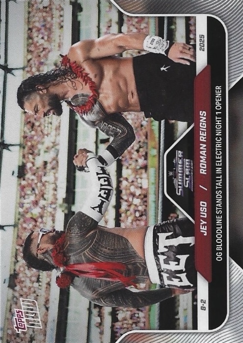 WWE TOPPS NOW 2025 – JEY USO / ROMAN REIGNS OG BLOODLINE STANDS TALL IN ELECTRIC NIGHT 1 OPENER #82