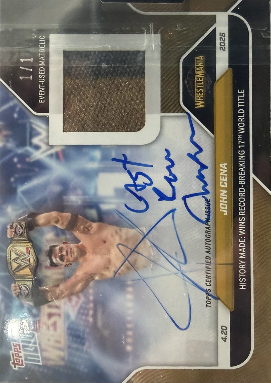 WWE TOPPS NOW 2025 – JOHN CENA HISTORY MADE: WINS RECORD-BREAKING 17TH WORLD TITLE #46D – FOIL FRACTOR PARALLEL AUTOGRAPH RELIC