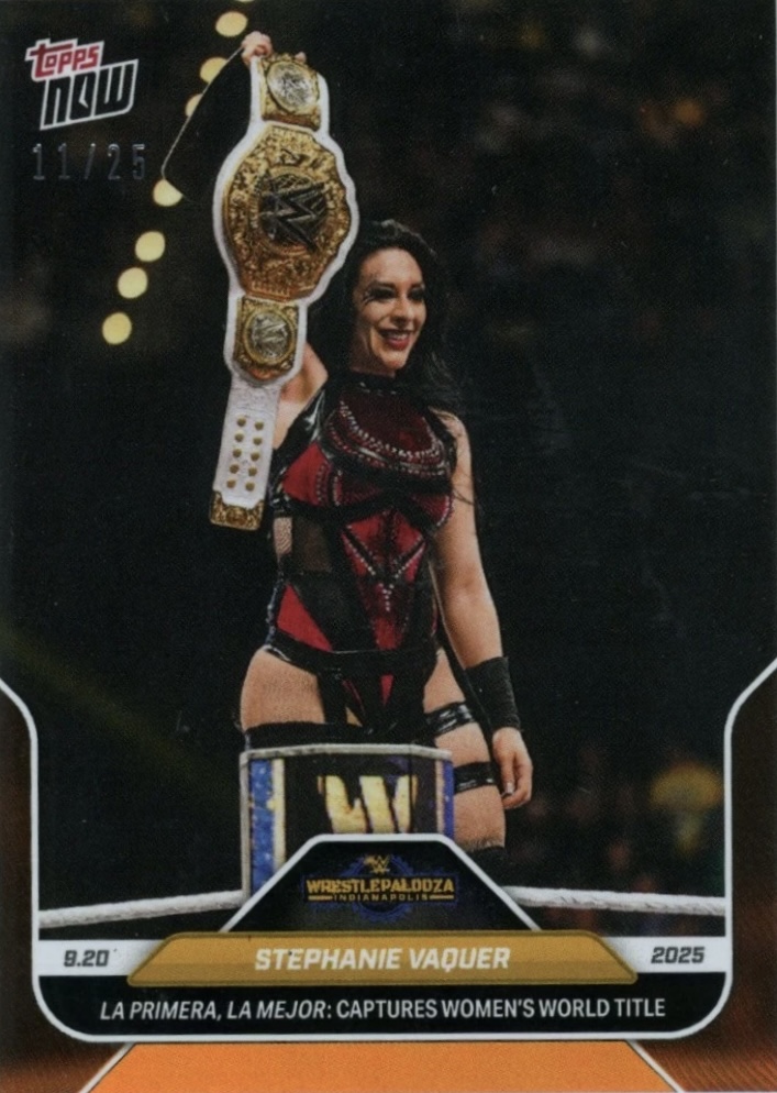 WWE TOPPS NOW 2025 – STEPHANIE VAQUER LA PRIMERA, LA MEJOR: CAPTURES WOMEN’S WORLD TITLE #97 – ORANGE PARALLEL