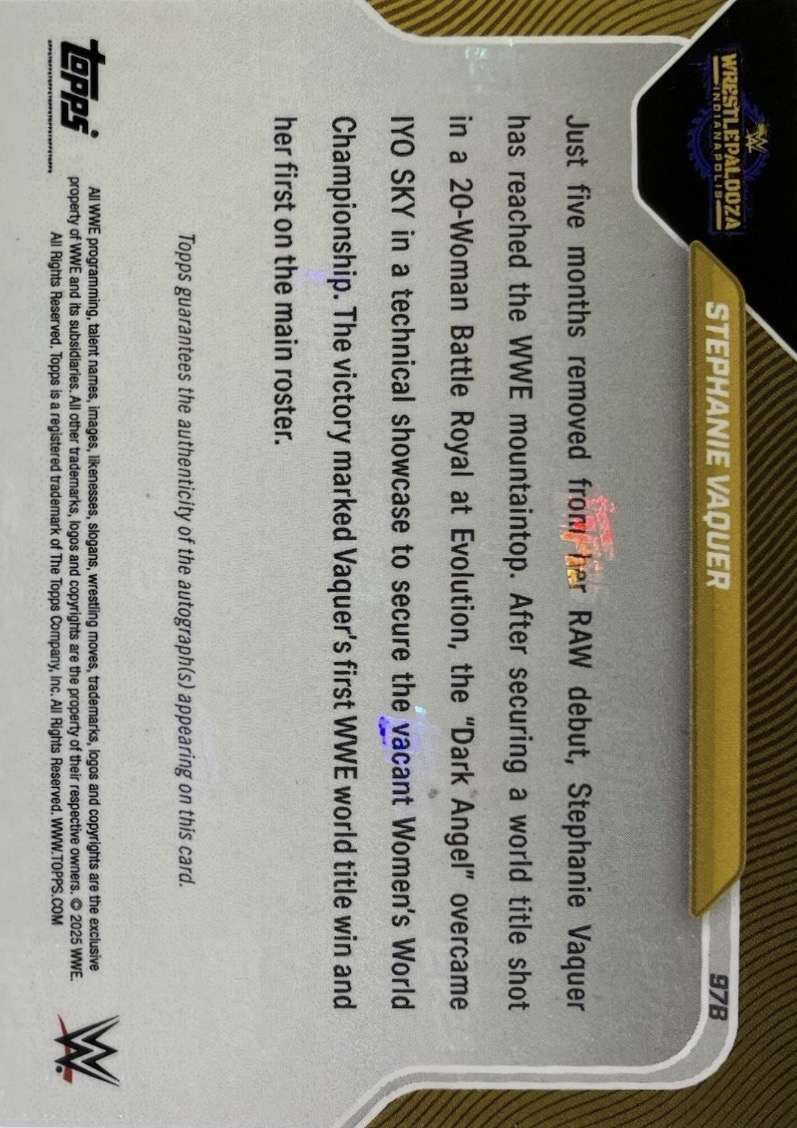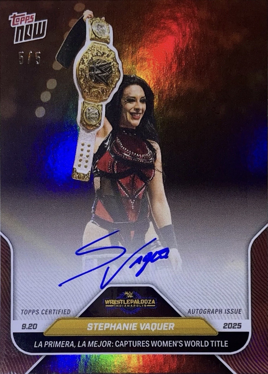 WWE TOPPS NOW 2025 – STEPHANIE VAQUER LA PRIMERA, LA MEJOR: CAPTURES WOMEN’S WORLD TITLE #97B – RED PARALLEL AUTOGRAPH