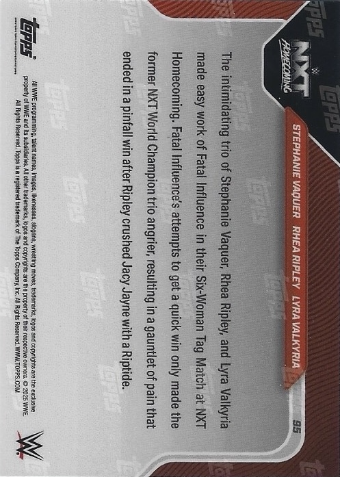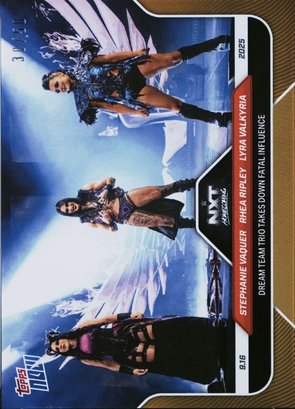 WWE TOPPS NOW 2025 – STEPHANIE VAQUER / RHEA RIPLEY / LYRA VALKYRIA DREAM TEAM TRIO TAKES DOWN FATAL INFLUENCE #95 – GOLD PARALLEL