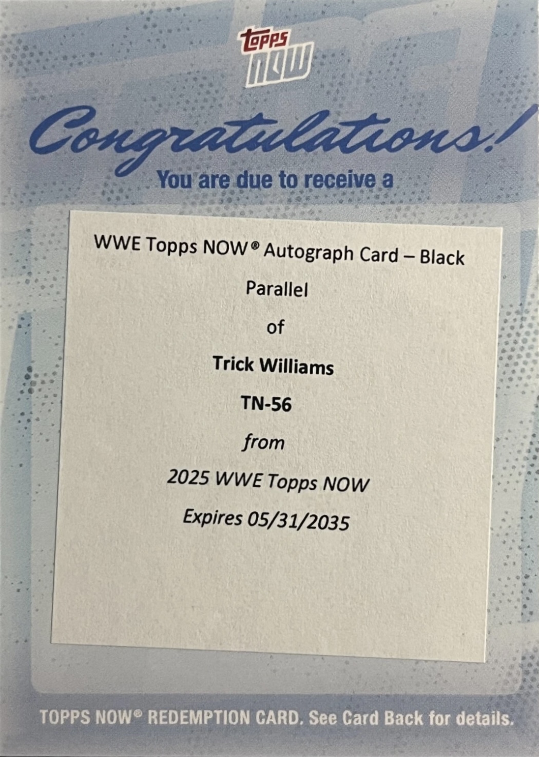 WWE TOPPS NOW 2025 – TRICK WILLIAMS #TN-56 – BLACK PARALLEL AUTOGRAPH REDEMPTION CARD