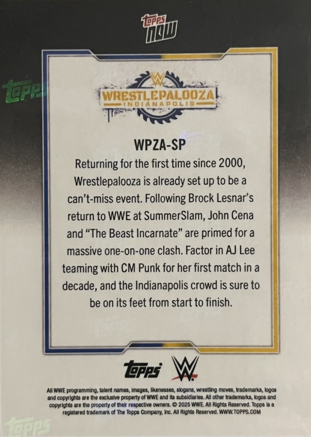 WWE TOPPS NOW 2025 – WRESTLEPALOOZA INDIANAPOLIS – CENA / LESNAR #WPZA-SP